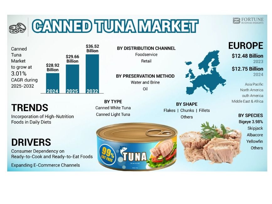 世界のツナ缶市場は、2024年時点で約289億2,000万米ドルと評価されており、2025年には296億6,000万米ドル、2032年には365億2,000万米ドルに達すると予測されている。忙しい生活スタイルの普及、即席食品の需要増加、保存性の高さなどが市場成長を支える主要な要因となっている。