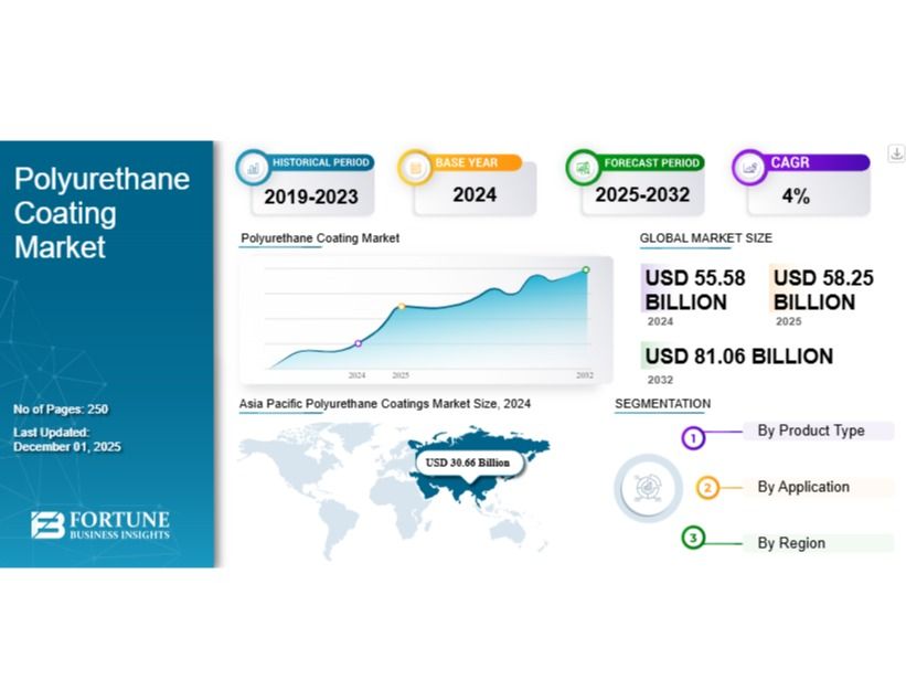 世界のポリウレタン塗料市場規模は2024年に555億8000万米ドルと評価された。市場は2025年の582億5000万米ドルから2032年までに810億6000万米ドルへ成長し、予測期間中に年平均成長率(CAGR)4.9%を示すと予測されている。アジア太平洋地域は2024年に55.16%の市場シェアを占め、ポリウレタン塗料市場を支配した。