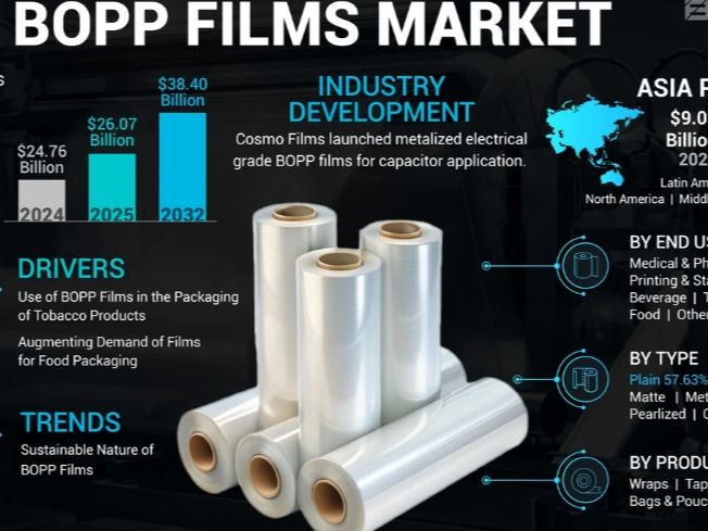 The global BOPP Films Market is experiencing steady growth, driven by the rising demand for flexible and high-performance packaging solutions across food, tobacco, pharmaceutical, and industrial sectors. The market was valued at USD 24.76 billion in 2024 and is projected to reach USD 38.40 billion by 2032, expanding at a CAGR of 5.69% during the forecast period.