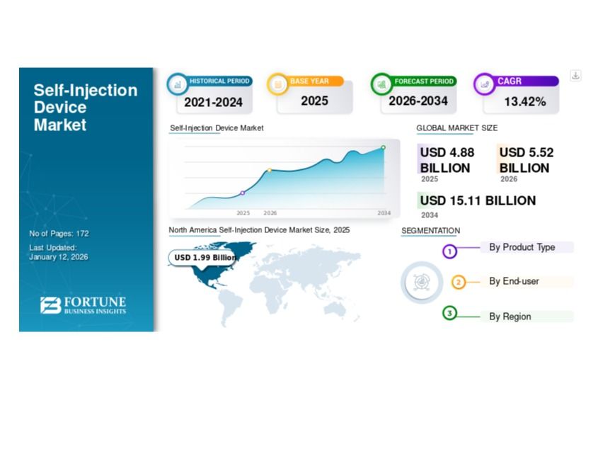 The global Self-Injection Device Market is witnessing strong growth, driven by the increasing prevalence of chronic diseases, rising demand for home-based healthcare, and continuous technological advancements in drug delivery systems. The market is projected to grow from USD 5.52 billion in 2026 to USD 15.11 billion by 2034, registering a robust CAGR of 13.42% during the forecast period.
