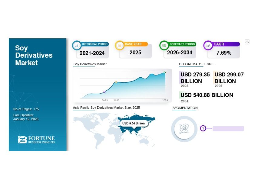 The global soy derivatives market is experiencing strong growth, supported by increasing demand for plant-based proteins, expanding livestock feed requirements, and rising industrial applications. According to industry analysis, the market is projected to grow from USD 299.07 billion in 2026 to USD 540.88 billion by 2034, registering a healthy CAGR of 7.69% during the forecast period.