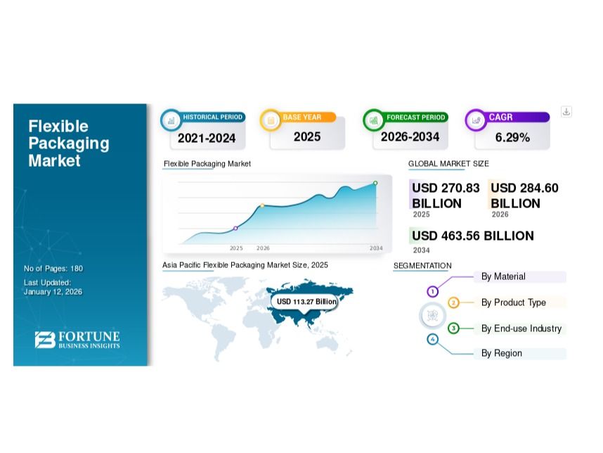 The global flexible packaging market is experiencing robust growth, driven by expanding demand in food & beverage, pharmaceuticals, cosmetics, and e-commerce sectors. According to Fortune Business Insights, the market was valued at USD 270.83 billion in 2025 and is projected to reach USD 463.56 billion by 2034, growing at a CAGR of 6.29% during the forecast period.