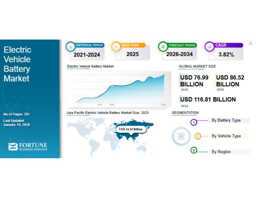 In 2025, the global electric vehicle battery market was valued at USD 76.99 billion. With the increasing production of electric vehicles and growing investments in battery manufacturing infrastructure, the market is expected to reach approximately USD 116.81 billion by 2034, expanding at a CAGR of 3.82% during the forecast period from 2026 to 2034.