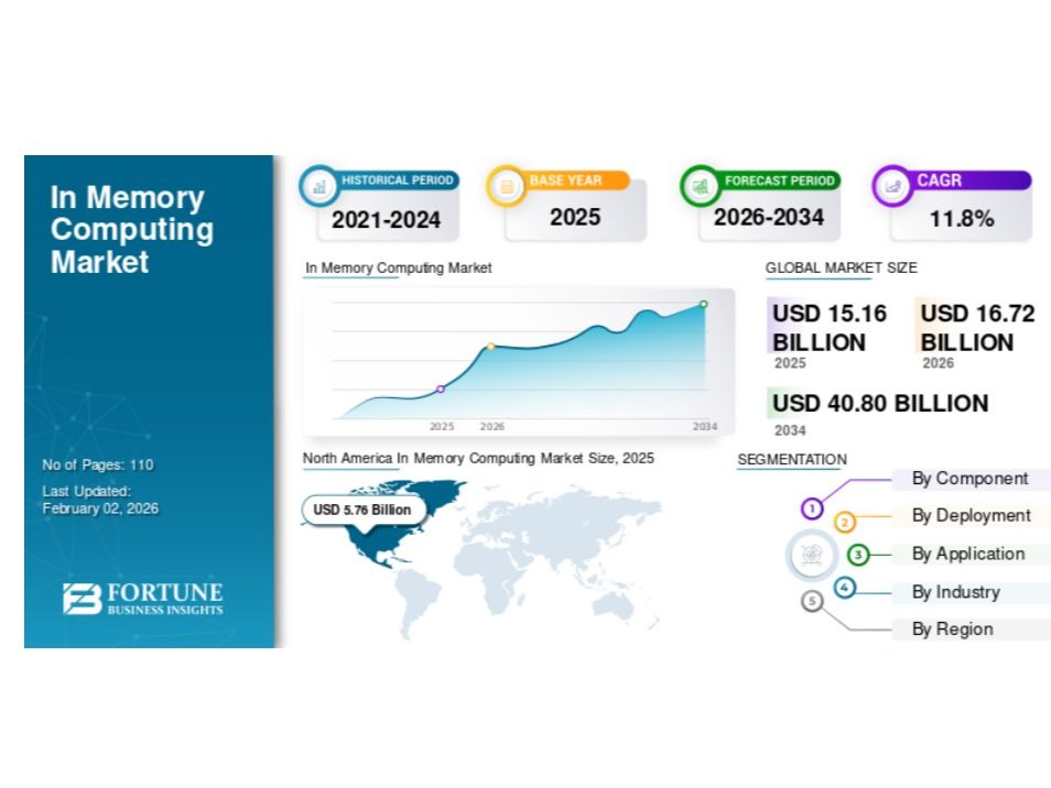 The In Memory Computing Market is witnessing significant expansion as enterprises increasingly prioritize real-time analytics, AI-powered applications, and high-speed data processing. According to Fortune Business Insights, the global market was valued at USD 15.16 billion in 2025 and is projected to grow from 2026 onward, reaching USD 40.80 billion by 2034, at a CAGR of 11.8% during the forecast period (2026–2034).
