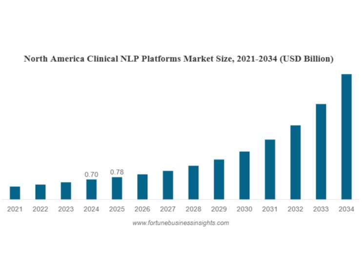 According to Fortune Business Insights, The clinical NLP platforms market size was valued at USD 2.14 billion in 2025. The market is projected to grow from USD 2.46 billion in 2026 to USD 13.15 billion by 2034, exhibiting a CAGR of 23.33% during the forecast period. North America dominated the global clinical NLP platforms market with a market share of 36.45% in 2025.