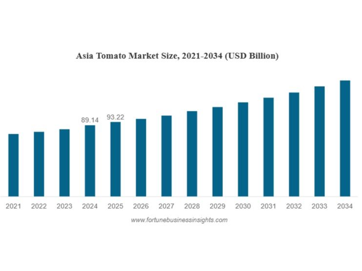 According to Fortune Business Insights, The Asia tomato market size was valued at USD 93.22 billion in 2025. The market is projected to grow from USD 97.54 billion in 2026 to USD 145.41 billion by 2034, exhibiting a CAGR of 5.12% during the forecast period.
