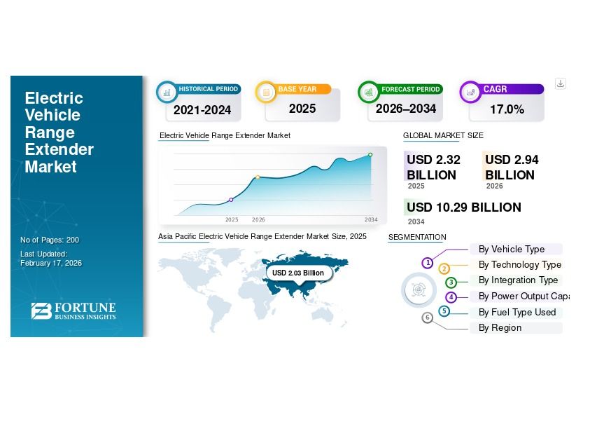 According to Fortune Business Insights, the global electric vehicle range extender market was valued at USD 2.32 billion in 2025 and is projected to grow to USD 2.94 billion in 2026, reaching approximately USD 10.29 billion by 2034. The market is expected to expand at a CAGR of around 17% during the forecast period (2026–2034).