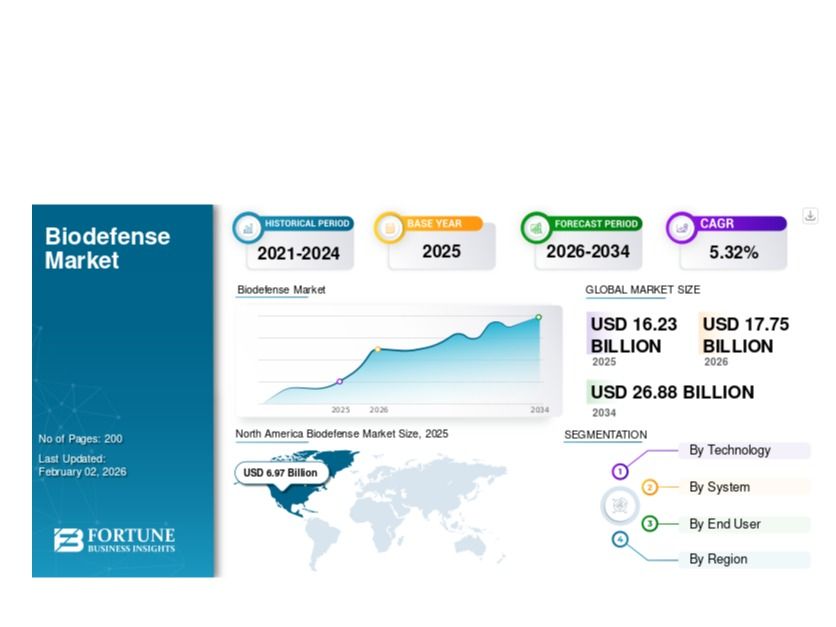 The global Biodefense Market is experiencing steady growth as governments and healthcare organizations strengthen their preparedness against biological threats. According to Fortune Business Insights, the market was valued at USD 16.23 billion in 2025 and is projected to reach USD 26.88 billion by 2034, registering a CAGR of 5.32% during the forecast period (2026–2034).