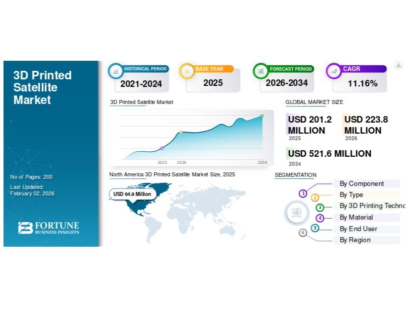 The 3D Printed Satellite Market is transforming the aerospace industry by enabling lightweight, cost-efficient, and highly customizable satellite components using advanced additive manufacturing technologies. According to Fortune Business Insights, the market was valued at USD 201.2 million in 2025 and is projected to reach USD 521.6 million by 2034, expanding at a CAGR of 11.16% during 2026–2034.