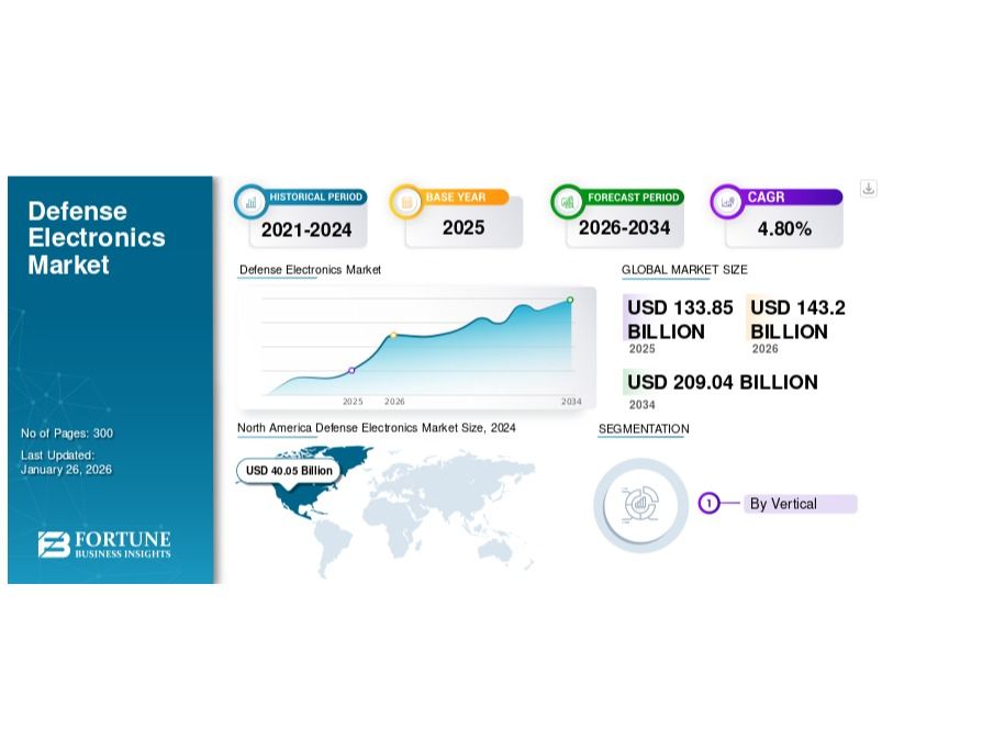 The Defense Electronics Market is witnessing steady growth as global defense forces invest heavily in modernization programs, digital battlefield technologies, and multi-domain operational capabilities. According to industry analysis, the global defense electronics market was valued at USD 133.85 billion in 2025 and is projected to reach USD 209.04 billion by 2034, growing at a CAGR of 4.8% during the forecast period (2026–2034).