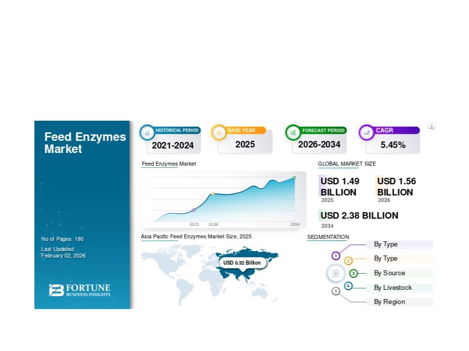 The Feed Enzymes Market is experiencing steady growth due to the increasing demand for high-quality animal feed and sustainable livestock production. According to Fortune Business Insights, the market was valued at USD 1.49 billion in 2025 and is projected to reach USD 2.38 billion by 2034, registering a CAGR of 5.45% during the forecast period.