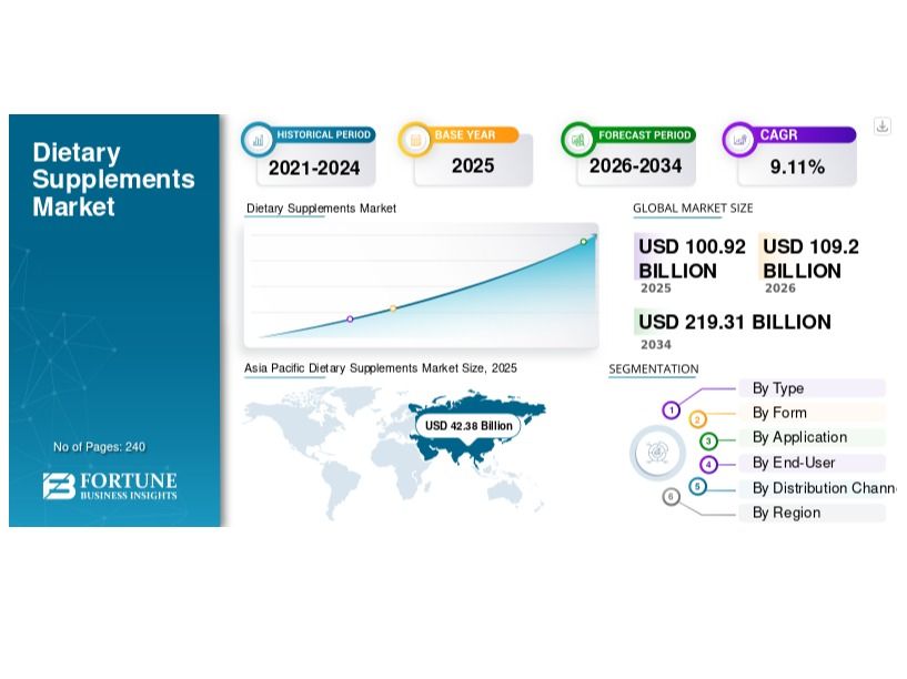 According to Fortune Business Insights, The dietary supplements market size was valued at USD 100.92 billion in 2025. The market is projected to grow from USD 109.20 billion in 2026 to USD 219.33 billion by 2034, exhibiting a CAGR of 9.11% during the forecast period. Asia Pacific dominated the global dietary supplements market with a market share of 42.0% in 2025.