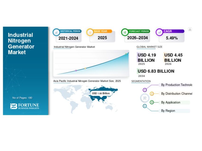 The global Industrial Nitrogen Generator Market was valued at USD 4.19 billion in 2025 and is projected to grow from USD 4.45 billion in 2026 to USD 6.83 billion by 2034, registering a CAGR of 5.49% during the forecast period. The market expansion is driven by rising industrialization, increasing demand for high-purity nitrogen, and growing adoption of on-site nitrogen generation technologies across various sectors.