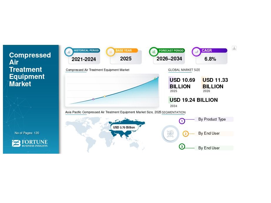 According to industry analysis, the Compressed Air Treatment Equipment Market size was valued at USD 10.69 billion in 2025 and is projected to grow from USD 11.33 billion in 2026 to USD 19.24 billion by 2034, exhibiting a CAGR of 6.8% during the forecast period.