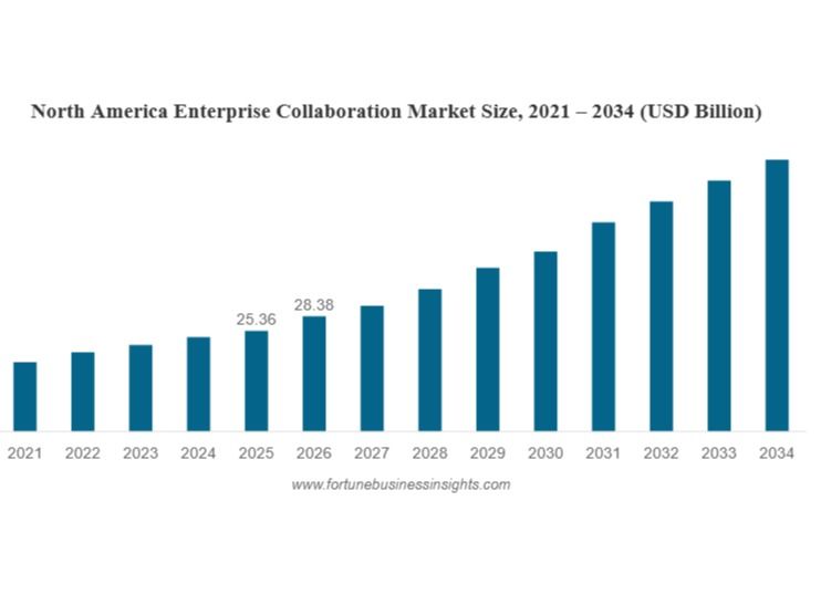 According to Fortune Business Insights, The global enterprise collaboration market size was valued at USD 59.67 billion in 2025 and is projected to grow from USD 66.43 billion in 2026 to USD 161.04 billion by 2034, exhibiting a CAGR of 11.70% during the forecast period. North America dominated the enterprise collaboration market with a share of 42.60% in 2025.