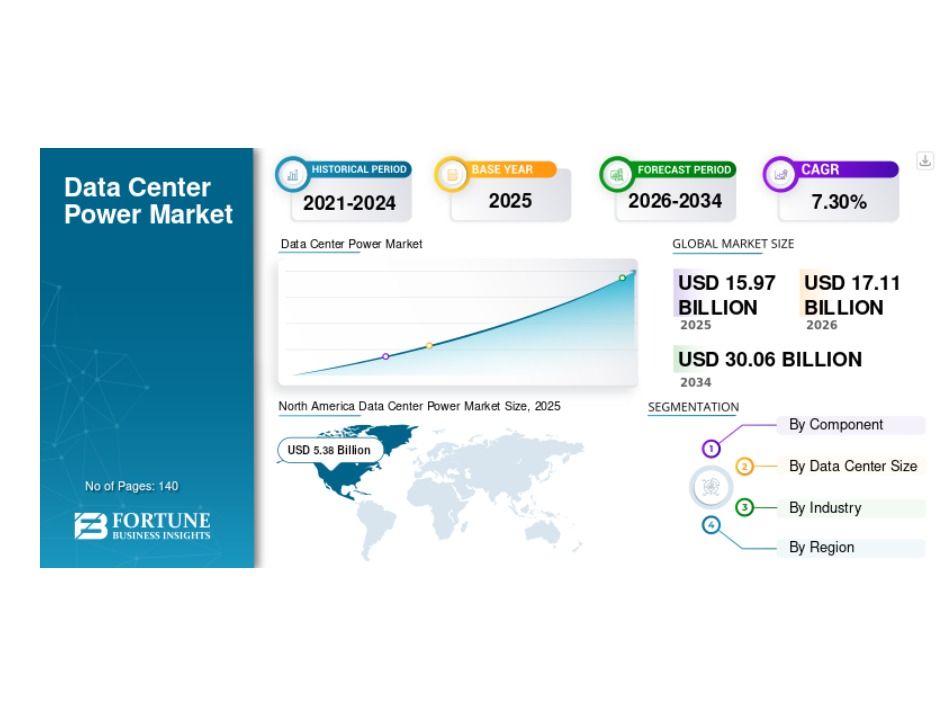 The global Data Center Power Market was valued at USD 15.97 billion in 2025 and is projected to grow from USD 17.11 billion in 2026 to USD 30.06 billion by 2034. The market is expected to register a compound annual growth rate (CAGR) of 7.30% during the forecast period from 2026 to 2034.