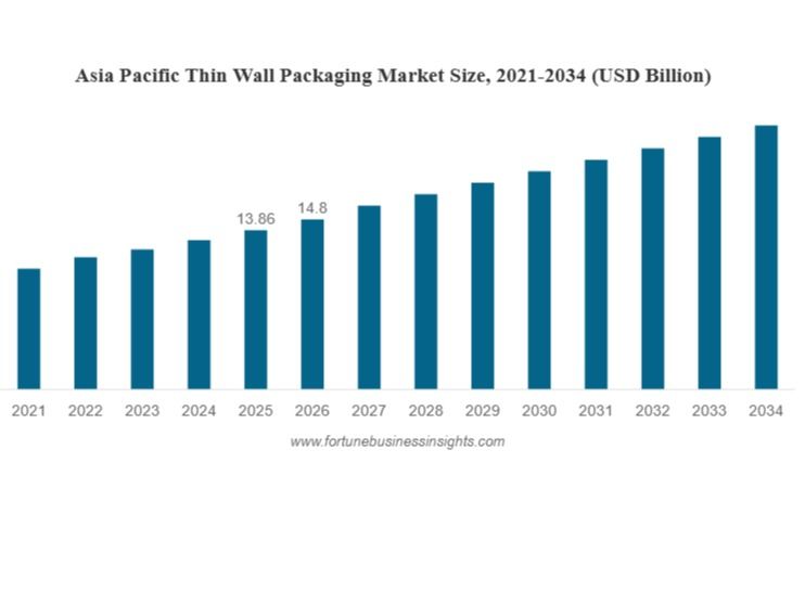 According to Fortune Business Insights, The global thin wall packaging market size was valued at USD 43.94 billion in 2025 and is projected to be worth USD 46.5 billion in 2026 and reach USD 76.59 billion by 2034, exhibiting a CAGR of 6.46% during the forecast period. Asia Pacific dominated the thin wall packaging market with a market share of 31.53% in 2025.