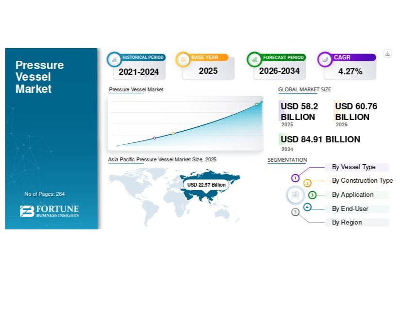 The global Pressure Vessel Market size was valued at USD 58.20 billion in 2025 and is projected to grow from USD 60.76 billion in 2026 to USD 84.91 billion by 2034, registering a CAGR of 4.27% during the forecast period.