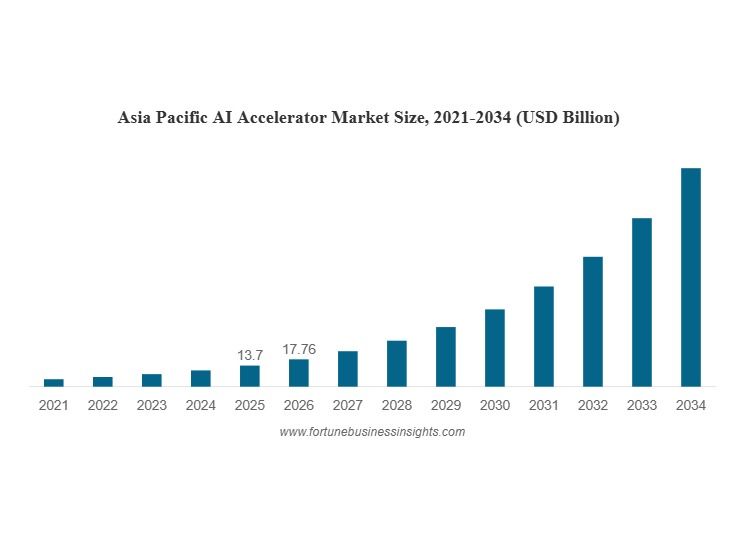 According to Fortune Business Insights, The global AI accelerator market size was valued at USD 33.69 billion in 2025 and is projected to grow from USD 43.75 billion in 2026 to USD 309.23 billion by 2034, exhibiting a CAGR of 30.7% during the forecast period. Asia Pacific dominated the AI accelerator market with a market share of 40.70% in 2025.