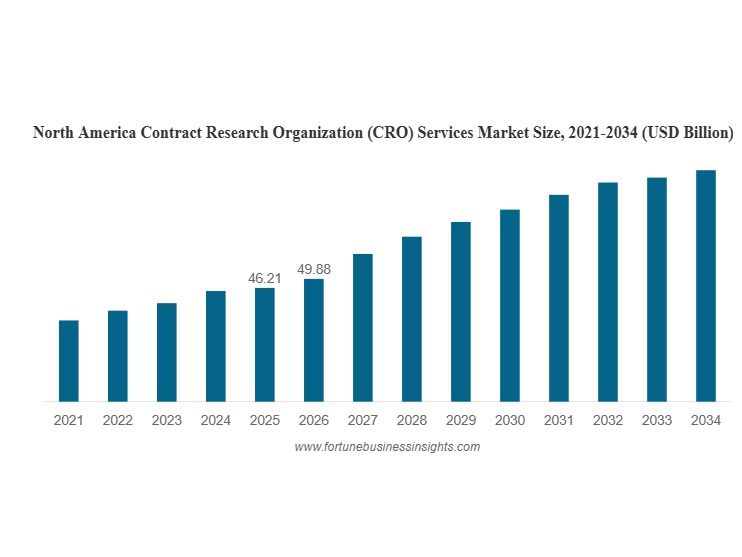 According to Fortune Business Insights, The global contract research organization (CRO) services market size was valued at USD 92.27 billion in 2025. The market is projected to grow from USD 99.87 billion in 2026 to USD 199.28 billion by 2034, exhibiting a CAGR of 9% during the forecast period. North America dominated the CRO services market with a market share of 50.10% in 2025.
