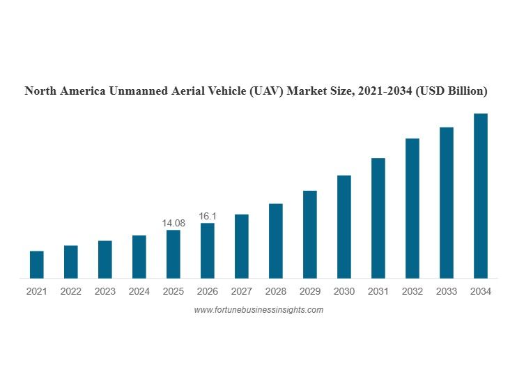 According to Fortune Business Insights, The global Unmanned Aerial Vehicle (UAV) market size was valued at USD 41.27 billion in 2025 and is projected to grow from USD 47.55 billion in 2026 to USD 160.44 billion by 2034, exhibiting a CAGR of 16.40% during the forecast period. North America dominated the unmanned aerial vehicle market with a market share of 34.12% in 2025.