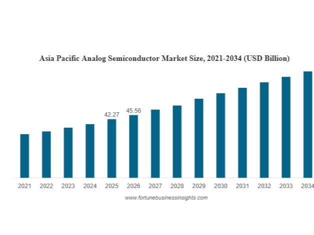 According to Fortune Business Insights, The global analog semiconductor market size was valued at USD 93.71 billion in 2025 and is projected to grow from USD 99.35 billion in 2026 to USD 154.05 billion by 2034, exhibiting a CAGR of 4.82% during the forecast period. Asia Pacific dominated the market with a share of 45.11% in 2025.