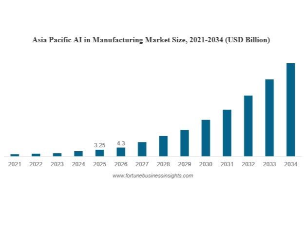 According to Fortune Business Insights, The global artificial intelligence in manufacturing market size was valued at USD 7.6 billion in 2025 and is projected to grow from USD 9.85 billion in 2026 to USD 128.81 billion by 2034, exhibiting a CAGR of 37.90% during the forecast period. The Asia Pacific dominated global market with a share of 42.80% in 2025.