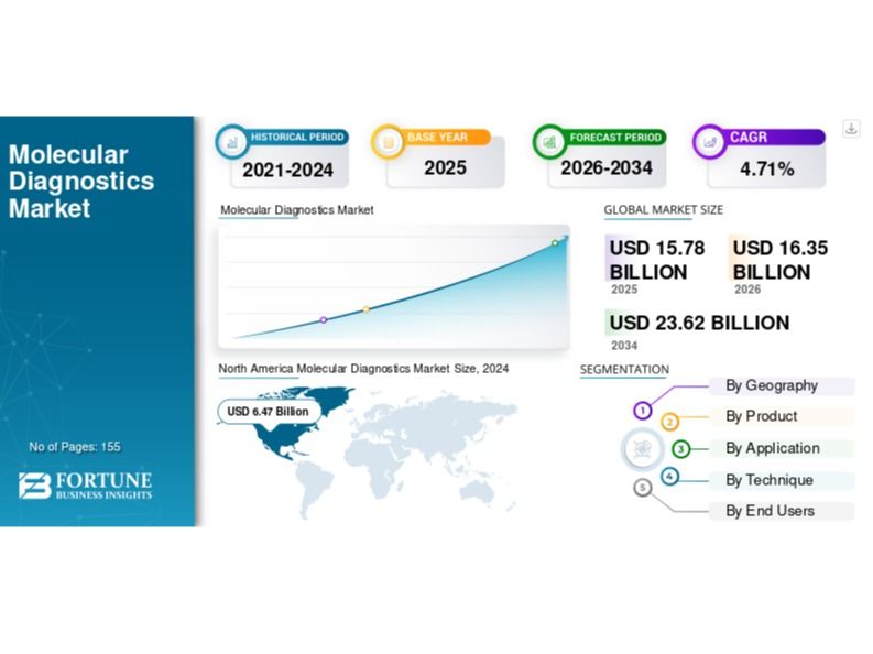 The molecular diagnostics market was valued at USD 15.78 billion in 2025 and is projected to grow from USD 16.35 billion in 2026 to USD 23.62 billion by 2034, exhibiting a CAGR of 4.71% during the forecast period. This growth is driven by rising healthcare awareness and the adoption of advanced diagnostic solutions globally.