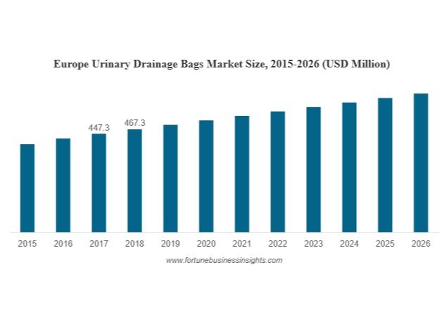 According to Fortune Business Insights, The global urinary drainage bags market size was valued at USD 1,007.8 million in 2018 and is projected to reach USD 1,964.4 million by 2032, exhibiting a CAGR of 4.9% during the forecast period (2018-2032). Europe dominated the urinary drainage bags market with a market share of 46.37% in 2018.